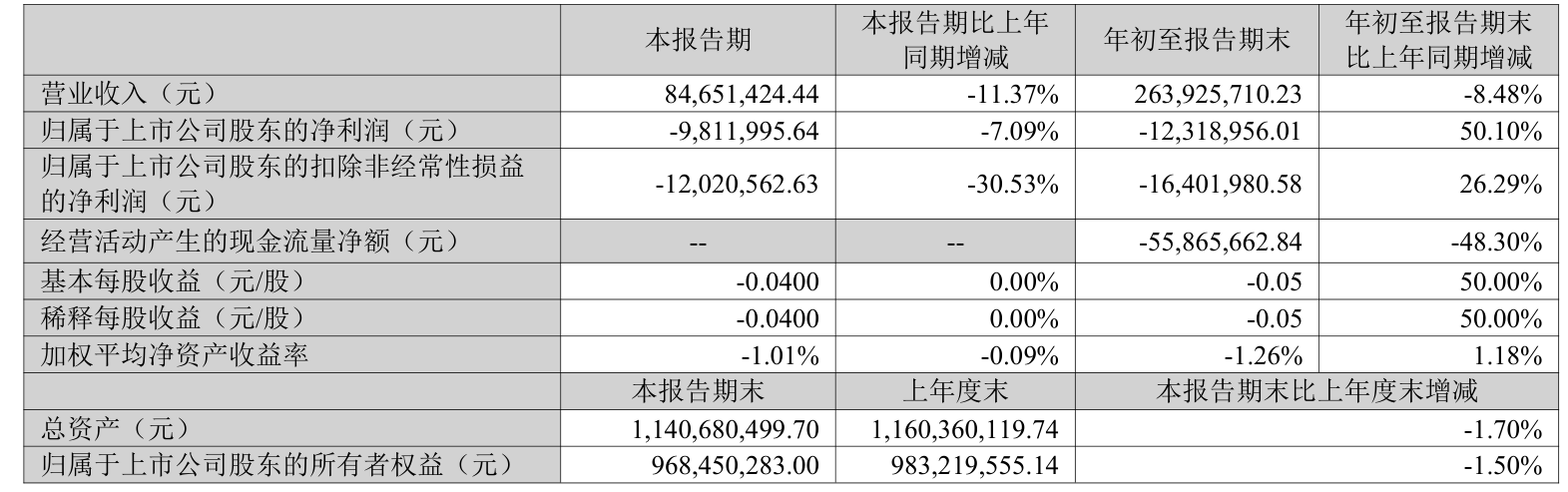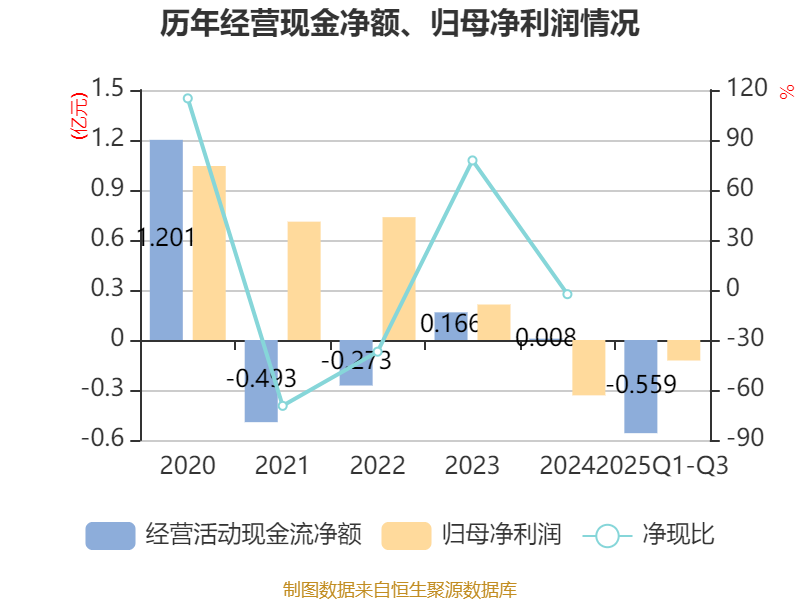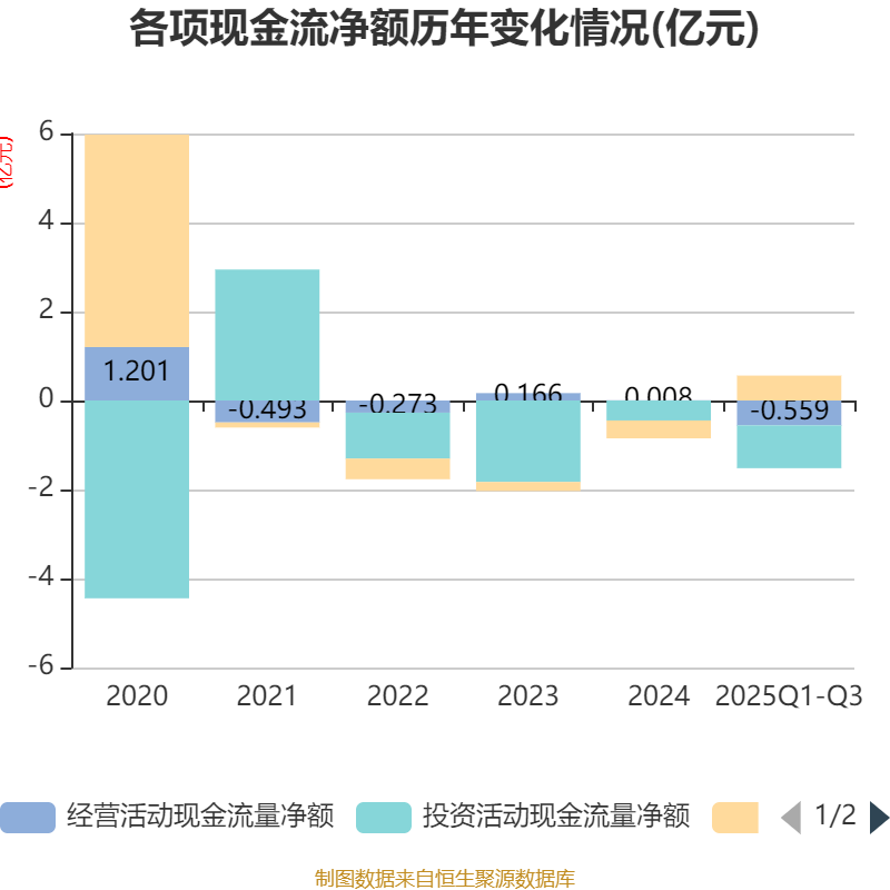 2025年前三季度,公司经营活动现金流净额为-5586.57万元,同比减少1819.61万元;筹资活动现金流净额5601.37万元,同比增加6814.72万元;投资活动现金流净额-9618.83万元,上年同期为-5193.53万元。